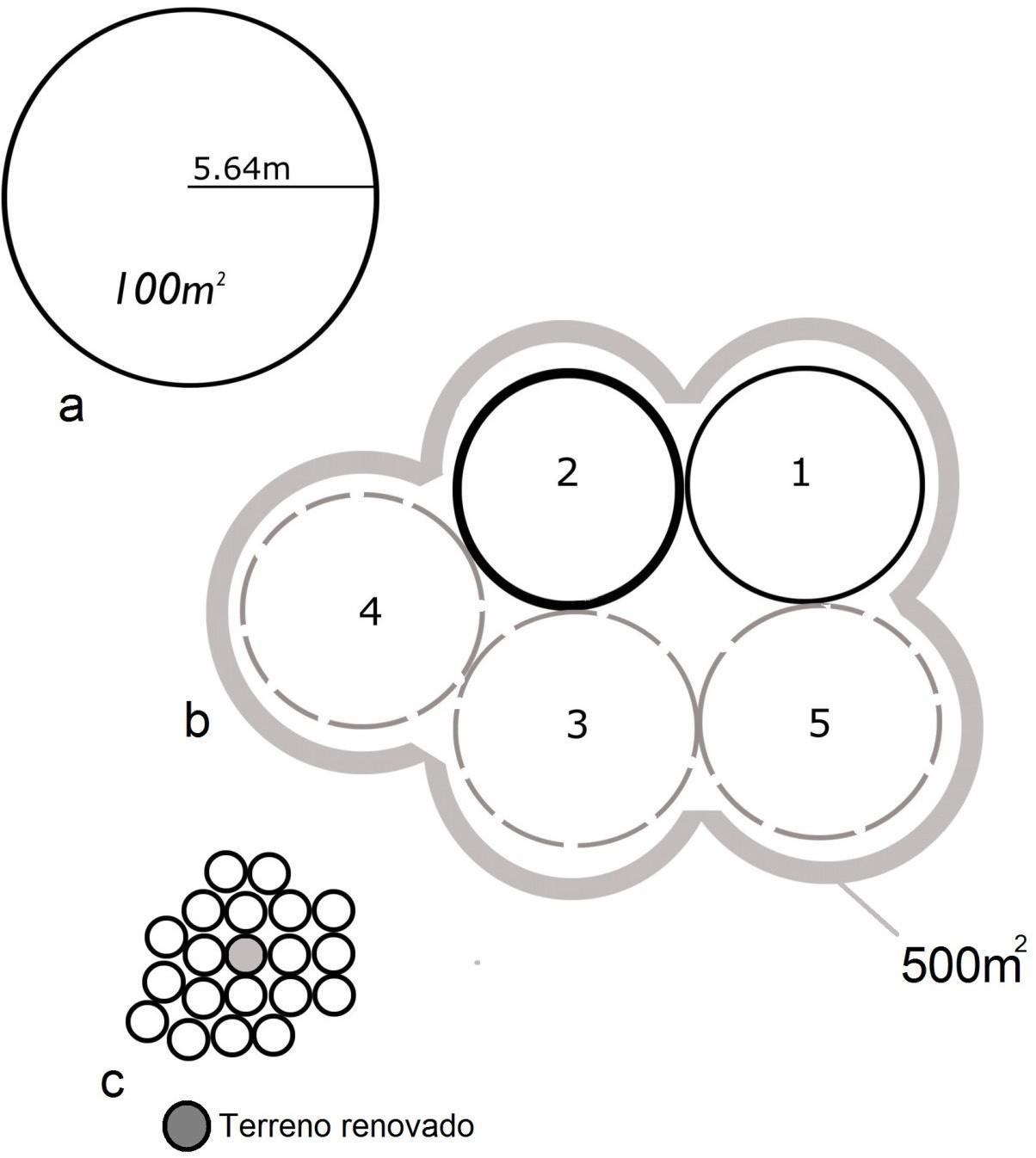 La incorporación de este modelo es de suma importancia para este estu- dio, ya que nos permite evaluar el impacto de esta tecnología productiva en el medio ambiente del manglar. Si aplicamos el modelo de Amalli y Cavalli (1973, 1984) en la zona de manglar de Centla, obtenemos los siguientes resultados: en un área de 100 m2 se producen 20 costales, obteniéndose una producción de 200 kg de carbón vegetal, es decir 2 kg por 1.0 m2 de bosque. En la figura 9 obser- vamos la zona que se tala para la producción (a); tras un periodo de 5 años, un mismo grupo familiar se expandiría en un área de 500 m2, en el caso estudiado registramos el área 2, habiéndose talado el área 1 un año antes (b); finalmente,