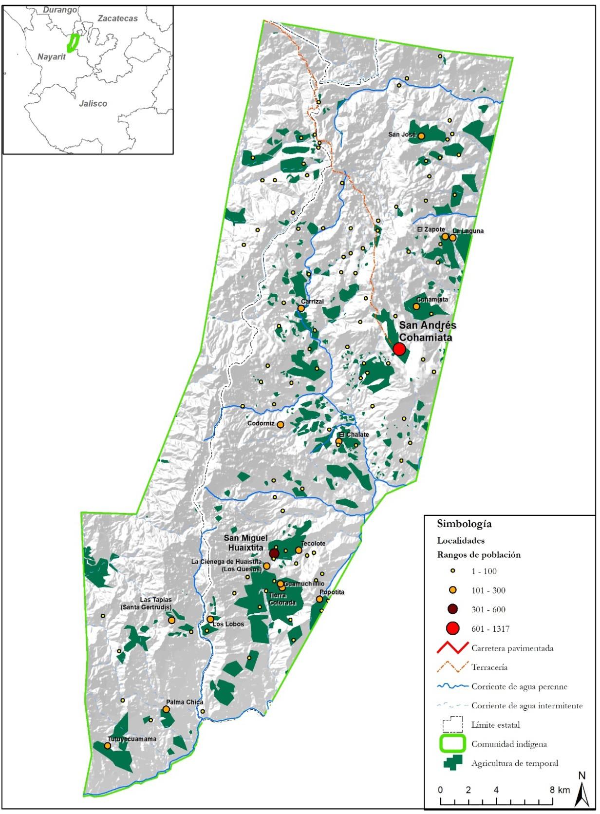 Mapa 1. Polígono agrario de San Andrés Cohamiata con sus principales localidades y área de agricultura milpera de temporal5 (Elaborado por Marco Hernández y diseñado por el autor, 2019)