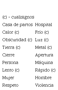 Con mi pregunta, demando a mi interlocutora a un ejercicio comparativo, sin embargo, ella teje una relación de oposición, la tierra contra el metal, quizá como representación de la naturaleza rivalizada con la tecnología. Cuando Renata se ubica dentro del contraste “aquí” devela una toma de posición. En el siguiente esquema reúno algunas29 de las figuras reiterativas, algunas son cualisignos presen- tes en el discurso de mis interlocutores: parteras, usuarias y sus parejas.