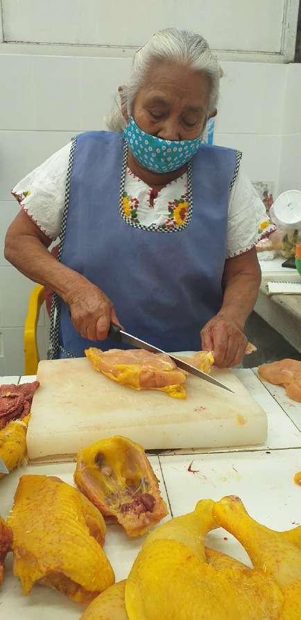 Profesora de Tiempo Completo, Facultad de Ciencias para el Desarrollo Huma- no, Universidad Autónoma de Tlaxcala (México)Mujeres mayores haciendo frente a la pandemia y la proveeduría de sus hogaresEsta fotografía fue tomada en un mercado municipal de Morelos, México. Doña Anita, menciona que pese a las sugerencias que el gobierno estatal y municipal han expresado para que las personas mayores se queden en casa, ella manifiesta que su vida cotidiana está enmarcada en el trabajo informal, con la venta de po- llo. Es la manera de mantenerse activa y con ingresos económicos para los gastos en su hogar. Ha tomado algunas recomendaciones como el uso del cubre bocas y gel antibacterial, para evitar el contagio y contagiar a los demás.