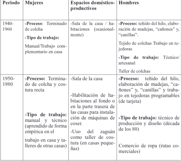 Hacia 1950 cuando la producción de colcha se encontraba en auge, las mujeres se incorporaron al proceso productivo de esta mercancía (ver cuadro 1). Por las tardes, después de realizar las actividades domésticas y de crianza, las madres de familia con sus hijos se reunían para realizar el “trenzado” de las colchas, -que también se realizaba con el rebozo- y que consistía en un adorno colocado en el perímetro de la prenda.
