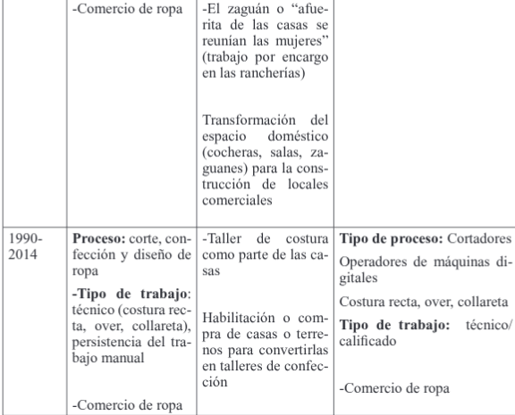 La disponibilidad de mano de obra doméstica y su adjetivación como actividad de “tiempo libre” propició que el trabajo de las mujeres fuera gestionado y nego- ciado en los límites de espacio privado. Se fraguó una nueva organización social en torno al trabajo y, con ello, se reforzó el funcionamiento de la casa-taller como unidad económica. En la década de los ochenta, la mano de obra femenina prác- ticamente era el principal motor de la economía de estos lugares, ya que permitió la incorporación de producción “por encargo” o maquila de prendas, con lo que