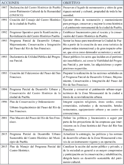 Políticas de intervención para el rescate del Patrimonio Cultural en Puebla (1993-2019) En este apartado se hace una revisión de los planes y programas elaborados para el rescate del patrimonio cultural en Puebla en los últimos 30 años, describiendo la evolución de las políticas que inciden en el desarrollo de la actividad turística. La exploración realizada a los instrumentos de planeación muestra las acciones específicas cuyos objetivos se vinculan directamente con el turismo y patrimonio cultural en el centro histórico de la Ciudad de Puebla (Fig. 03)