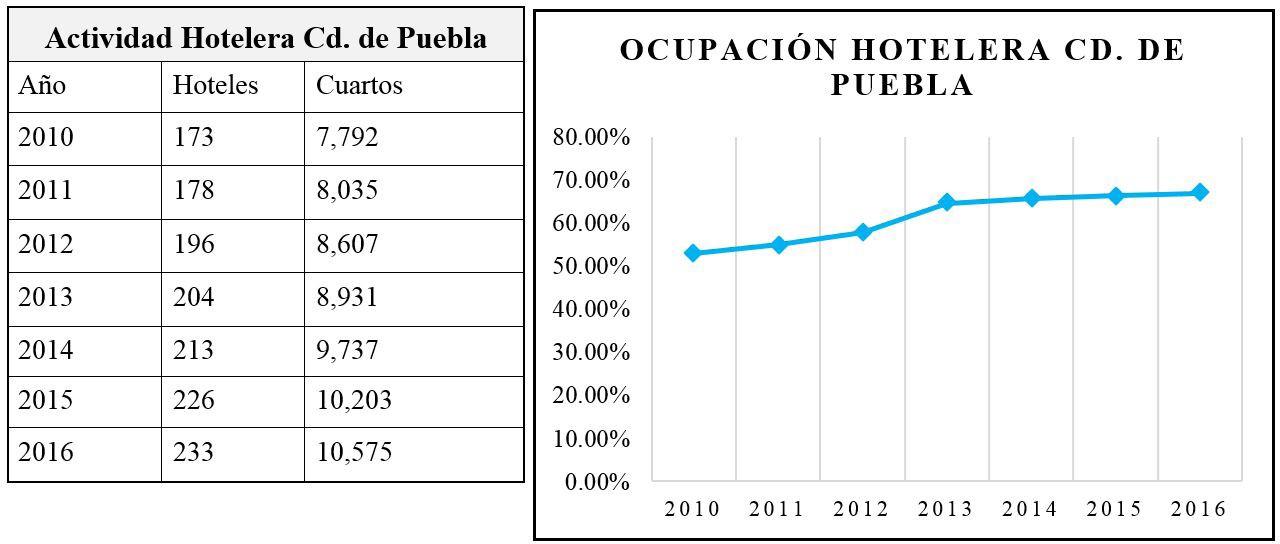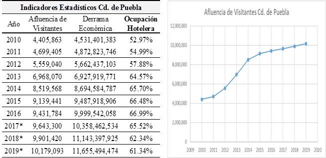 En el último año se ha realizado una intensa promoción y difusión de los atrac- tivos turísticos del estado de Puebla con el fin de captar a un mayor número de turistas y visitantes. Resultado de ello es el crecimiento del 5.44% en la afluencia de visitantes en el periodo del 1 de agosto al 31 de octubre de 2019, dando un registro de 3,900,000 de personas en solo tres meses (Gobierno del Estado de Puebla, 2019). En consecuencia, la derrama económica tuvo un incremento de 5.71% respecto al 2018, alcanzando los $ 3,890, 000,000, de pesos (S/F, 2019). De acuerdo con el Sistema Nacional de Información Estadística del Sector Tu- rismo de México (DATATUR), en el estado de Puebla en el fin de semana largo del 14 al 16 de septiembre la ocupación hotelera se incrementó en un 26.9% con respecto a la misma fecha del año anterior (2018).