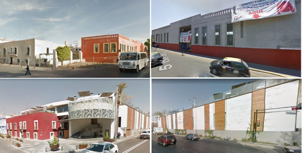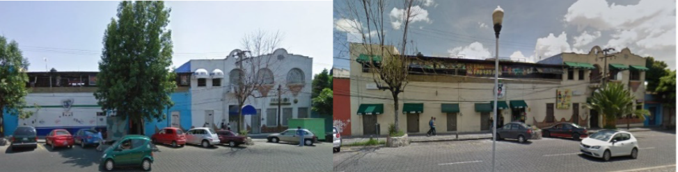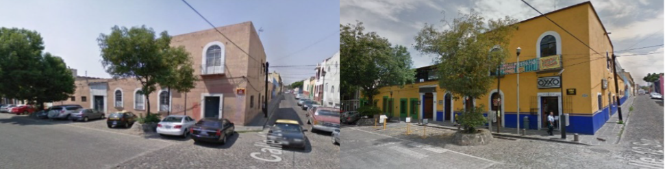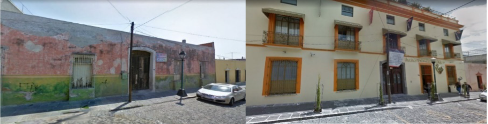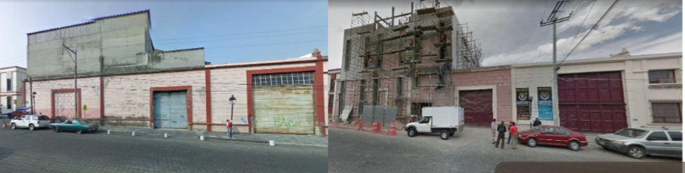 Fig. 13. Comparación del actual hotel Cartesiano ubicado sobre boulevard 5 de mayo y avenida 3 oriente entre el año 2011 y el 2018. Fuente: (REYES, 2020)