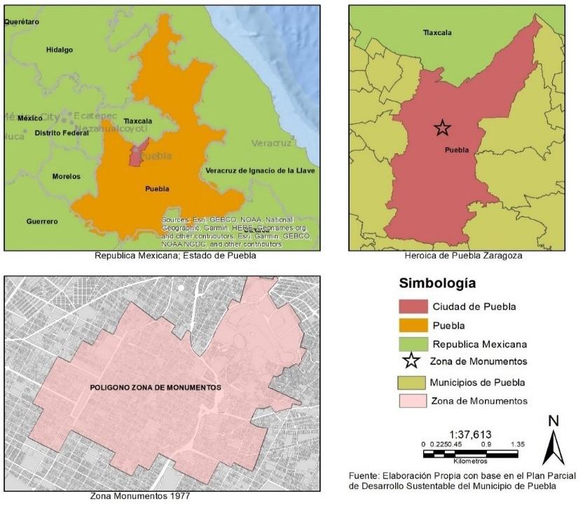 El centro histórico de la ciudad de Puebla pertenece a la 4ª Zona Metropolitana más importante del territorio mexicano, esta última es considerada como una zona estratégica de desarrollo por sus atractivos artísticos, históricos y cultura- les (Gobierno M. d., 2014). La relación de sus espacios y estructura urbana son testimonio de excepcional valor histórico, social, político y cultural. El Centro Histórico fue decretado “Zona de Monumentos Históricos en la Ciudad de Pue- bla de Zaragoza” en el año 1977. En 1987 fue inscrito en la lista de patrimonio mundial de la Organización de las Naciones Unidas para la Educación, la Ciencia y la Cultura (UNESCO), formando parte de las 10 ciudades del país que además cuentan con declaratoria de Zona de Monumentos Históricos. Posteriormente, y como dato más reciente, es su declaración como “Zona Típica Monumental” publicado el 31 de enero de 2005 (Gobierno del Estado, 2005).