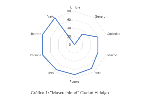 Dentro de los resultados que arrojó la técnica de las redes semánticas en Ciudad Hidalgo se encontró que la de mayor peso fue Hombre (100%), seguida de Género (68%), Sociedad (40%), Macho (40%), Sexo (30%), Fuerte (28%), Sexy