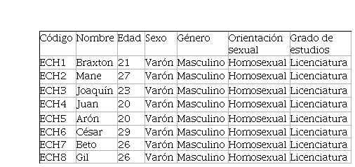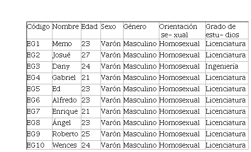 Se entrevistó a 18 varones residentes de Guadalajara, Jalisco y Ciudad Hidalgo, Michoacán. Diez personas eran de la primera ubicación, cuyas edades oscila- banentre los 21 y 27 años de edad, la mayoría son originarios y residentes de