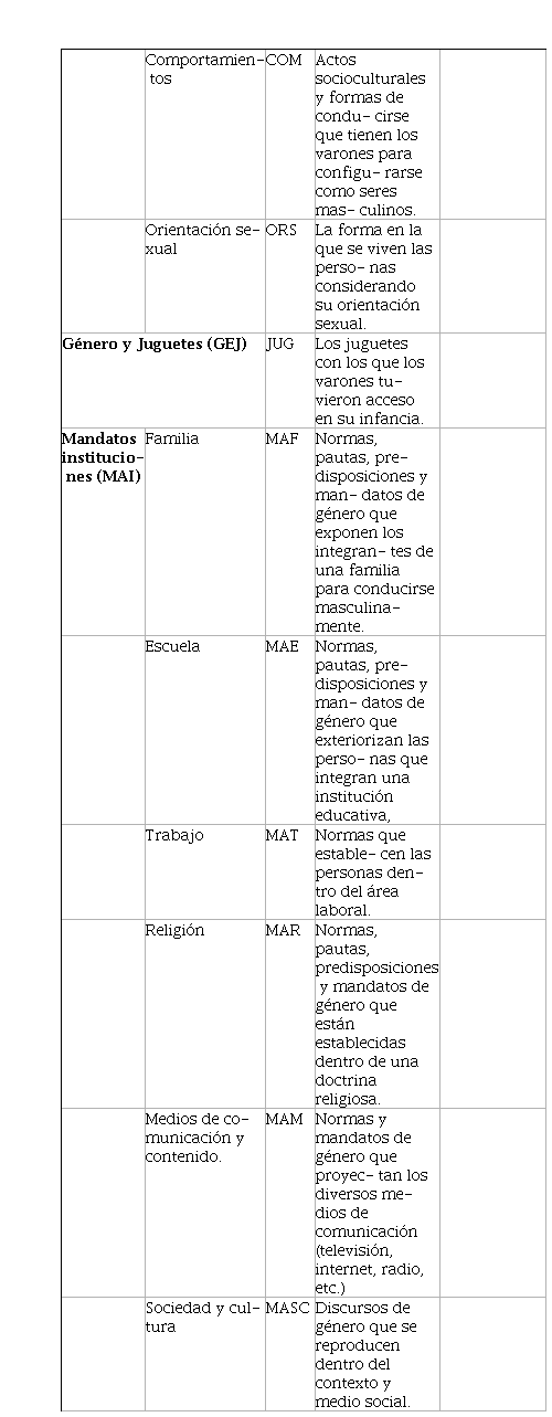 Dicho lo anterior, antes de comenzar la aplicación del instrumento se pro- porciona a los colaboradores una hoja con la palabra estímulo: masculinidad, y una clasificación descendente del 1 al 10, en la cual se les pide que escriban, tal como recordarán las palabras que creen que estaban asociadas con esta. En un segundo momento ya que hayan escrito las diez palabras (a las cuales podemos denominar definidoras), se les entregó una segunda hoja, ahora con la especifi- cación de que estas deberían ser jerarquizadas en relación a la palabra que creían que se acercaba más a la palabra estímulo, de tal manera que, la palabra que tenía una mayor relación se encontraría en el número uno y así sucesivamente, hasta llegar a la que consideraran tuviese menos relación