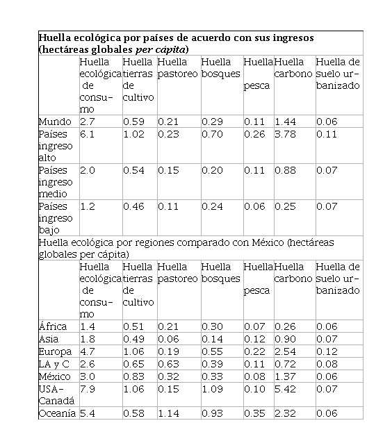 Por otra parte, en el siglo XX el consumo per cápita de materiales tuvo un incremento de 4.6 a 10.3 toneladas por año (McDonald et al., 2013); este con- sumo tiene relación con la huella ecológica que las sociedades humanas dejan en el planeta Tierra.3 Los países con mayor ingreso tienen una huella ecológica más elevada. En el cuadro 1 se aprecia la huella ecológica por regiones. Estados Unidos y Canadá, así como Oceanía y Europa son los que tienen la mayor huella ecológica de consumo. México, sin ser un país más desarrollado que otros de América Latina, tiene una huella ecológica superior a la media latinoamericana en varios aspectos.