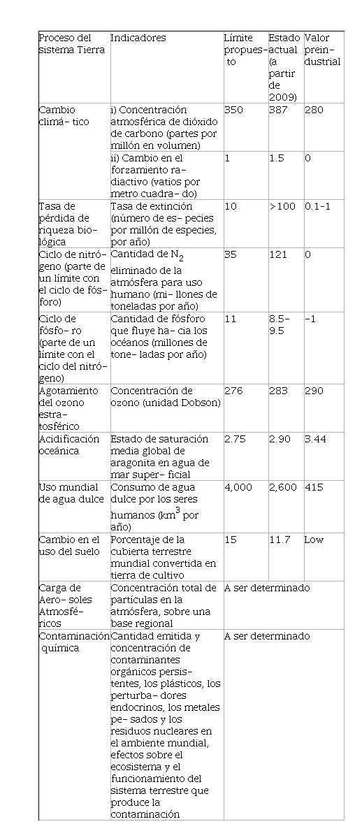 La propuesta para establecer los límites planetarios se deriva del trabajo del Stockholm Resilience Centre en el que se alude diez procesos críticos del sis- tema Tierra: 1) cambio climático, 2) tasa de pérdida de riqueza biológica, 3) ciclo de nitrógeno, 4) ciclo del fósforo, 5) agotamiento del ozono estratosférico, 6) acidificación del océano, 7) uso global del agua dulce, 8) cambio del uso del sue- lo, 9) carga de aerosoles atmosféricos y 10) contaminación química (cuadro 2).