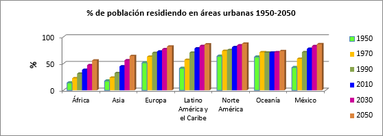 En el año 2050 la población mundial llegará a un aproximado de 9 mil 300 millones de personas (UNFPA, 2011) con una sociedad eminentemente ur- bana (Castaños, 2005; Population Reference Bureau, 2014). Se prevé que este incremento será mayor en África y Asia (Castaños, 2005). Así, se puede sugerir que África será el continente que experimente la tercera ola urbana triplicando su población: en 2011 contaba con 1,000 millones de habitantes, pero durante el presente siglo superará en seis veces a la población de América Latina y el Caribe y en más de 15 veces el crecimiento poblacional de Asia. En contrapartida, para el 2020 el crecimiento poblacional de Europa se reducirá (UNFPA, 2011; NU, 2014).