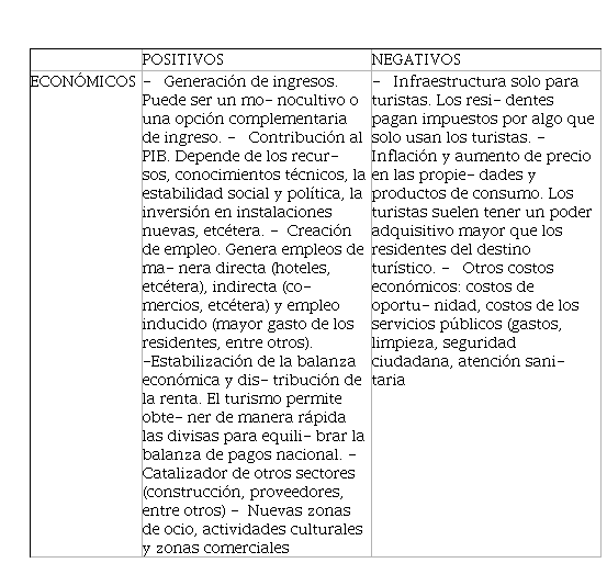 Tabla 1. Impactos económicos del turismo