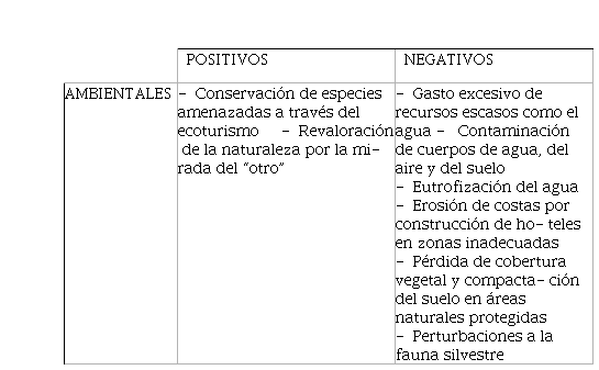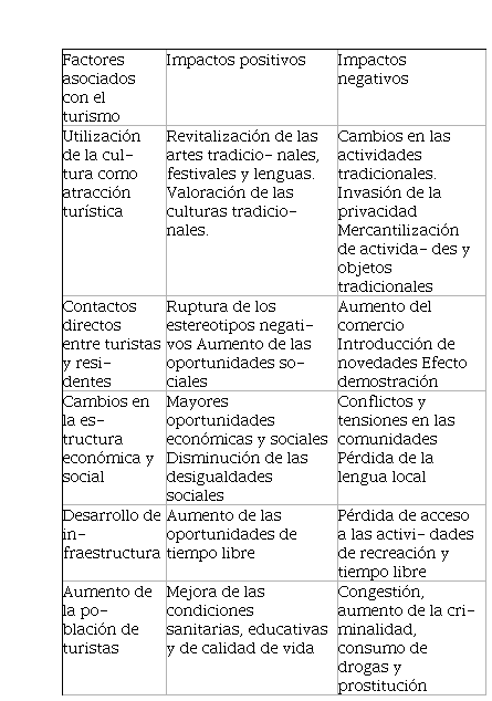 Ahora bien, los habitantes de cada destino sufren o gozan estos impactos en diferente medida, dependiendo del nivel del desarrollo en el que se encuentre el destino, del volumen y del gasto del turista, así como de la apropiación y del control que tengan los habitantes locales de la actividad turística (ver tabla 1)