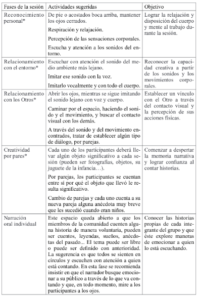 En un trabajo de intervención por medio de la narración oral para cualquier co- munidad, lo que se debe buscar, en primera instancia, es un espacio en el que los participantes puedan expresar con libertad y en un ambiente de respeto su sentir y sientan confianza para hacerlo. Este tipo de intervenciones son fundamentales para contribuir a crear comunidad en estos grupos porque “la narrativa social desde la oralidad expone condiciones ontológicas, éticas y estéticas que fortale- cen la solidaridad y los valores sociales” (Figueroa, 2019: 31).