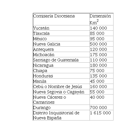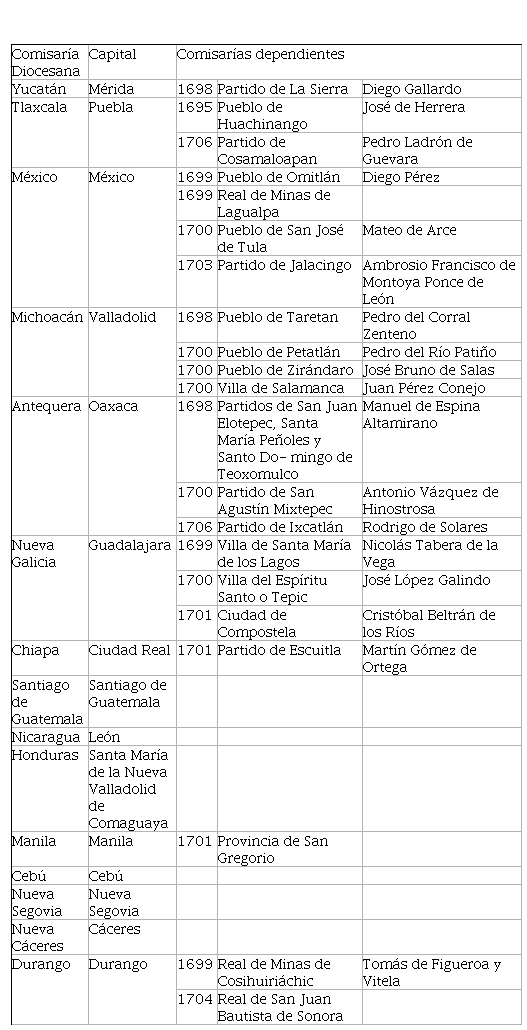 La dispersión de las comisarías novohispanas hacia el norte continuó durante este periodo. De manera que, a principios del siglo XVIII, los límites fronterizos del norte alcanzaron Sonora, el Rio Grande del Norte y la provincia de Nuevo México. En el extremo noreste, la comisaría más distante estaba en la ciudad de Monterrey.1 Las fronteras septentrionales pertenecían a las comisarías diocesanas de Durango y Nueva Galicia. En el extremo meridional, la frontera divisoria terminaba en la comisaría diocesana de Nicaragua. En el extremo po- niente, a una distancia de 3 000 leguas, se ubicaban las comisarías diocesanas de Manila, Cebú, Cagayán y Camarines.
