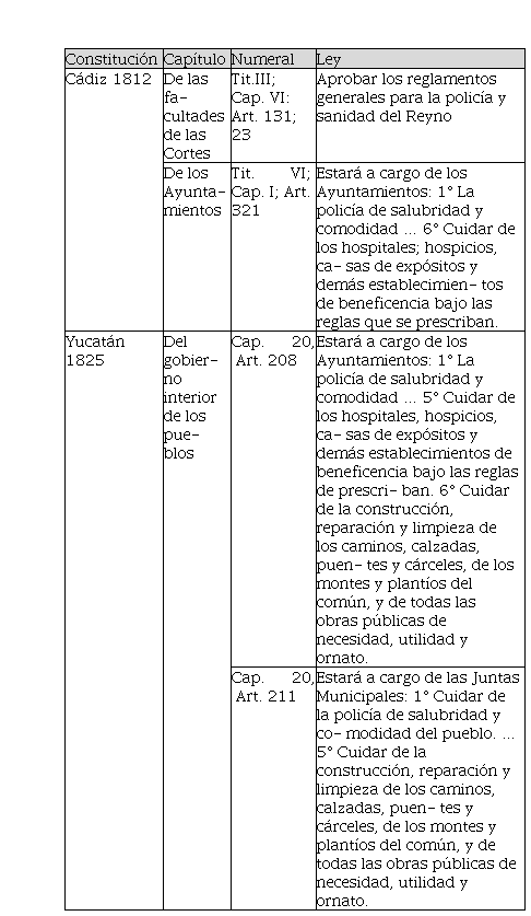 A pesar de que la legislación sanitaria en Yucatán se originó con la Constitución de 1825, en ese entonces no se emitió una ley específica para implementar sus disposiciones generales. Es decir que, aunque se estableció la responsabilidad de los ayuntamientos y municipios para mantener la salubridad, comodidad, bene- ficencia, limpieza y orden en los espacios públicos, no se detallaron los procedi- mientos ni aspectos operativos para su ejecución (Doc. 4).