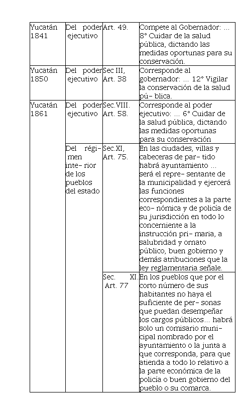 El segundo apartado, denominado “La dimensión política de la sanidad”, trata sobre las normas, y en él se detallan las leyes relacionadas con la salud pú- blica, tomando como base los siguientes textos constitucionales: la Constitución de Cádiz de 1812, la Constitución mexicana de 1824 y las constituciones de Yucatán de 1825, 1841, 1850, 1862 y 1870. Además, se consultó el “Reglamento para el gobierno interior de los pueblos” de 1841, la “Ley constitucional para el gobierno interior de los pueblos” de 1850 y sus reformas y adiciones de 1882.