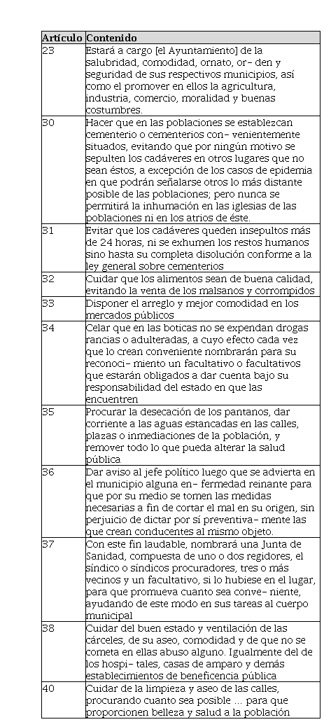 Las facultades municipales en materia de sanidad se regularon hasta 1841 en el “Reglamento para el gobierno interior de los pueblos” (Doc. 10), coinci- diendo con la nueva constitución estatal liberal (Doc. 6). En 1850, esta regulación se confirmó y legitimó mediante la “Ley Constitucional para el gobierno interno de las localidades”, con escasas modificaciones en términos de la sanidad. Esta ley fue ratificada en 1862, con cambios mínimos (Doc. 8).