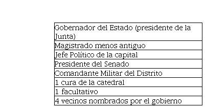 En 1850 quedó establecido que, dentro de la estructura de la administra- ción política, la Junta Suprema lideraba las Juntas Superiores que se formaban en cada uno de los 12 partidos en los que se dividía el estado, siendo presididas por el jefe político. Las Juntas Subalternas se establecían en los municipios que no eran la cabecera de los partidos4. En teoría, todas las juntas, independientemente de su jerarquía, debían tener una composición similar a la de la Junta Suprema, incluyendo representación política, militar, ciudadana, médica y religiosa. Sin embargo, esto no siempre era viable en todos los casos.