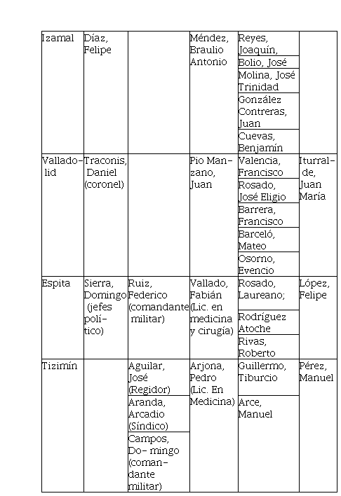 en Valladolid, Espita y Tizimín, debido a que eran los únicos lugares con bases permanentes. Recordemos que a lo largo de la mayor parte de la segunda mitad del siglo XIX, Yucatán estuvo envuelto en un conflicto armado, y precisamente la región oriental, compuesta por Valladolid, Espita y Tizimín, era la más tumul- tuosa y presentaba una mayor presencia militar.