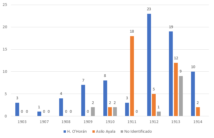 Se tiene registrados 131 arrestos entre 1903 a 1914; hasta antes de 1910, el único lugar de reclusión era el hospital O’Horán. Después de este año, entra en escena el Asilo para dementes “Ayala”, en el cual se recluían a personas que se encontraban perturbadas de la mente, aunque también se recluían a mujeres que se consideraban desviadas, y entre ellas estaban las mujeres públicas.