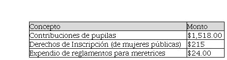 Las primeras tres filas de la tabla corresponden a las contribuciones moneta- rias voluntarias de las mujeres públicas, que suman un total de 3,069 pesos, lo cual corresponde a un 56% de los ingresos de la JSS. Ello permite vislumbrar el importante papel que tenían las recaudaciones relacionadas con el régimen de la prostitución en la institucionalización y financiamiento de la sanidad en su conjunto. En ese mismo año, la Junta reportó gastos por 4,244 pesos por diver- sos rubros como papelería, servicios de edificio de la Junta. En investigaciones diversas, de esta cantidad reportada por la Junta, 125.70 pesos corresponden a gastos del servicio ginecológico, es decir, que mientras la prostitución aportaba poco más del cincuenta por ciento de los ingresos, y cubría el 72.3% de los gastos de la Junta, los gastos derivados de los reconocimientos ginecológicos eran sólo el 3% de los ingresos de la JSS (Magaña, 2020:95-96).