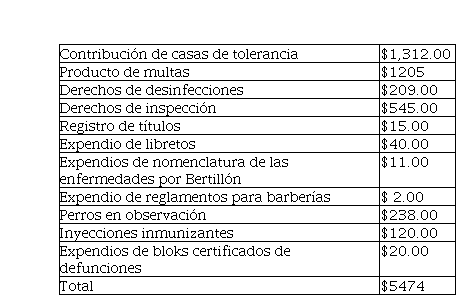 Para el año de 1911 se reportaron 5,474 pesos por conceptos de recauda- ciones, lo que se desglosa en el siguiente cuadro (Doc. 17):