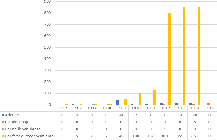 A estos ingresos habría que sumarles, también, la recaudación por concep- to de multas. Si tomamos los datos de en los años de 1912, 1913 y 1914 en donde se registran más multas en los libros, y en el supuesto de que todas las multas fueran pagadas, tenemos un total de $4,005, $4,275 y $4,255 por año, únicamen- te tomando en cuenta las multas por faltas a los reconocimientos ginecológicos. Asimismo, a estas cantidades habría que añadir los cobros de altas, de derechos a los reconocimientos, de libretas nuevas, las contribuciones de las casas de to- lerancia y la expedición de reglamentos para las mujeres de nuevo ingreso a la matrícula, datos que por desgracia no se pudieron obtener en el archivo. Aun con los vacíos de información, la cantidad de dinero recaudado es importante, más si lo comparamos con los 5,417 pesos de 1911 (Magaña, 2020;96).