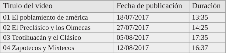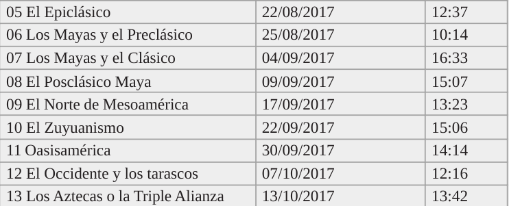 Consiste la serie en 13 videos disponibles en YouTube, publicados con una semana de diferencia entre el 18 de julio y el 13 de octubre del 2017. La dura- ción de los capítulos fluctúa entre los 10 y los 17 minutos (tabla 1). Esta duración fue sugerida por el profesor Escalante, pues es la apropiada para presentarse en el salón de clase y permitir la discusión posterior con los alumnos. Del mismo modo, me planteó que la serie recorriera toda el pasado de México hasta nuestros días. Este objetivo, sin embargo, no pude cumplirlo por las consideraciones que expondré más adelante.
