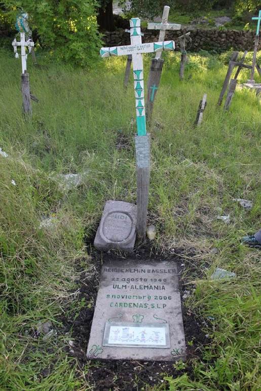 Cuándo una persona muere en Cárdenas, un automóvil con bocina se en- carga de bocear por las calles dicho deceso, la muerte de Heidi fue anunciada de esta manera la mañana del 8 de noviembre de 2006 a partir de la siguiente frase: “Murió la etnóloga francesa Heidi Chemin Bassler a la edad de 66 años” por tal razón, puedo decir que Heidi murió como cardenense. Su cuerpo fue cremado y durante meses, permaneció en soledad en la funeraria del municipio, hasta que se le hizo un ritual funerario en la comunidad de Santa María Acapulco para des- pués ser sepultada en el cementerio junto a sus compadres y amigos xi´úi.