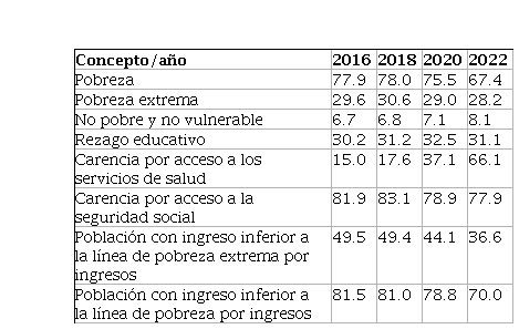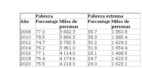 Como se observa en el cuadro 1, en 2008 el porcentaje de población en condiciones de pobreza fue de 77 por ciento, y en 2020 se situó en 75.5 por ciento, 1.5 pun-