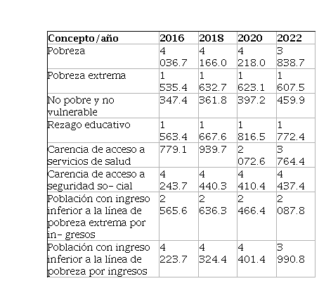 En seis años (2016-2022) se produjo una reducción en la cantidad absoluta de pobres en Chiapas, que pasó en números redondos de 4 millones a 3.8 millones, esto es, 198 000 personas menos. No obstante, el número sigue siendo muy alto, pues representa 67.4 por ciento con respecto a la población total estimada para el año 2022, que en números absolutos rondaba los 5.6 millones de habitantes.