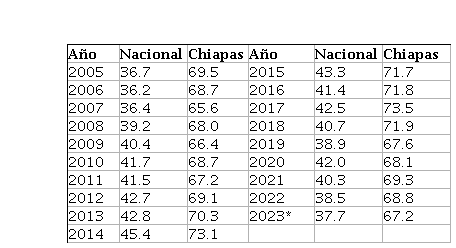 La diferencia del indicador con el promedio nacional fluctúa entre 89 y 79 por ciento, una diferencia abismal que coloca a Chiapas en el primer lugar de las entidades federativas en materia de precariedad laboral. Este indicador se correlaciona con los de pobreza general y de pobreza extrema, cuyos datos tampoco han variado durante los últimos años en las mediciones realizadas por el CONEVAL. Esto explica, en parte, la propensión a emigrar a otras entidades de la República y a Estados Unidos.