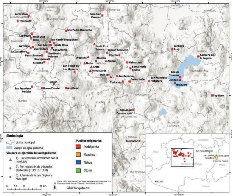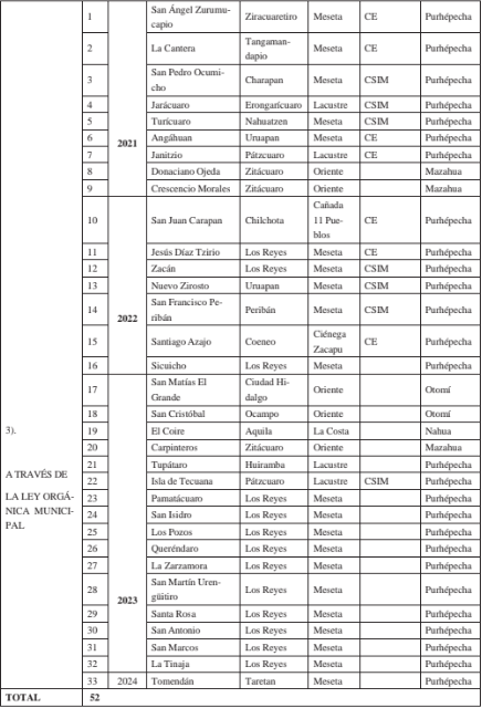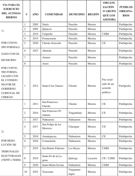 Hasta el 27 de enero del 2024 son 52 comunidades indígenas en autogobierno. De este total, 8 optaron por convenio formalizado con el municipio, 1 por convenio con el Consejo Mayor de Cherán, 10 transitaron por resolución de tribunales elec- torales y 33 optaron por el mecanismo que establece la Ley Orgánica Municipal.