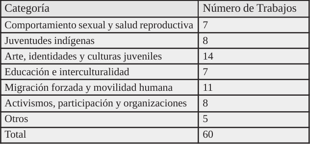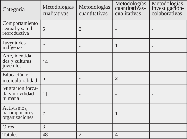 En total se registraron 60 trabajos publicados acorde al tema de investiga- ción. De estos textos, 55 fueron categorizados en 6 temáticas centrales y son los que componen principalmente este análisis. Los 5 restantes se colocaron en una categoría miscelánea y se recuperan hacia el final de este trabajo de manera tan- gencial. De los 55 trabajos analizados, 36 fueron artículos publicados en revistas y 19 capítulos de libros académicos. Las 6 categorías temáticas son: Comporta- miento sexual y salud reproductiva, Juventudes indígenas, Arte, identidades y culturas juveniles, Educación e interculturalidad, Migración forzada y movilidad humana y Activismos, participación y organizaciones (Cuadro 1).