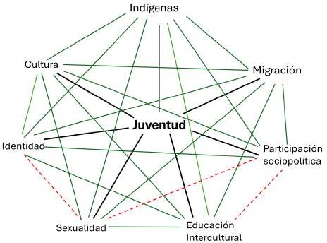 Los estudios muestran una articulación temática compleja lo que ha derivado en una paulatina articulación orgánica en las propuestas explicativas (líneas negras y verdes). Se induce que la ausencia de articulaciones (líneas rojas segmentadas), entre Identidad y Sexualidad, Participación sociopolítica y Sexualidad y entre Educación intercultural y Participación sociocultural es significativa de los sub- campos menos desarrollados (Figura 1).