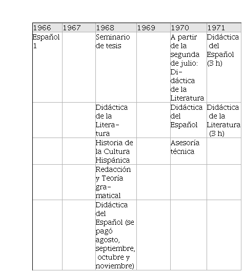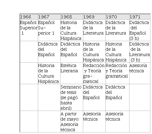 Por otro lado, la materia con menos resultados visibles en el cuadro fue Historia de la Cultura Hispánica, una materia muy informativa que, a decir de los entrevistados,8 trataba principalmente la historia y la cultura de España. Estas ca- racterísticas del curso son un indicador de que nuestra literatura latinoamericana se consideraba todavía dependiente de la española o parte de esta.