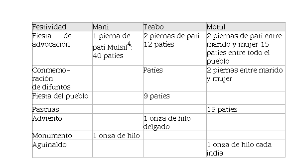 Del mismo modo, los religiosos también aprovechaban los productos que generaban los pueblos indígenas al cobrarles las limosnas,3 entre las que a menudo se incluían mantas de algodón y patíes. Solo por mencionar un ejemplo: en 1663, diversos regidores y alcaldes pidieron al defensor de indios que les fueran reba- jadas las limosnas, y para ello los pueblos hicieron un informe detallado de todos los géneros que proporcionaban a su doctrinero durante algunas de las principales fiestas de tres parcialidades durante un año. En la tabla 2 se presenta únicamente los que corresponden a productos elaborados con algodón: