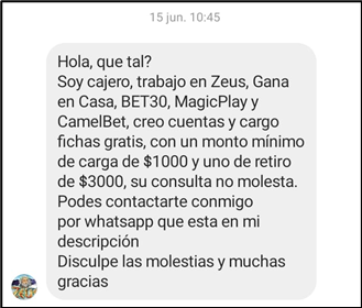 Ciertamente, conviene enfatizar que durante la comunicación no es un requisito que el usuario verifique tener la edad legal para desarrollar la actividad (mayor de 18 años), basta con que se corrobore las transferencias de dinero. Esto implica pensar que no hay un control que regule la actividad y quien participa de ella, sino que queda supeditado a la voluntad del cajero de turno.