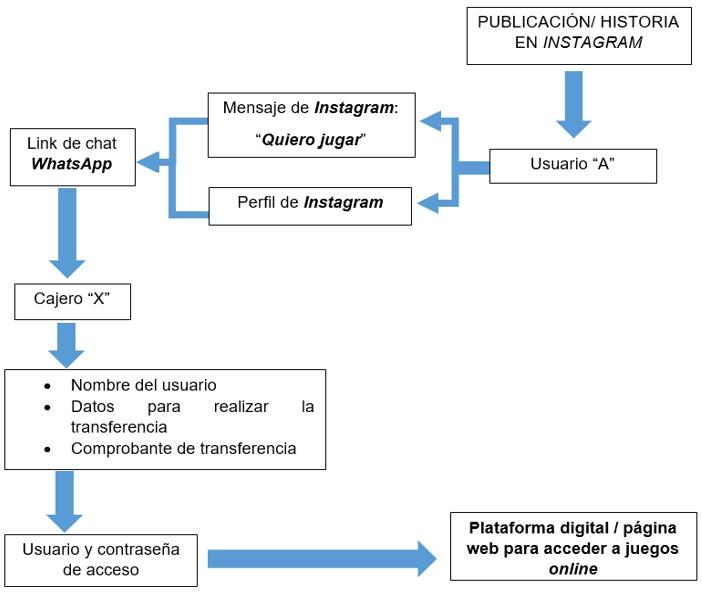 “Se le arma un usuario con contraseña, se le envía un link donde deben ingresar puede ser desde un celular, notebooks, etc., siempre y cuando tengan acceso a internet. Son juegos (tragamonedas, juegos en vivo, apuestas deportivas) en los cuales participan muchas per- sonas, de distintos lugares” (Cajera 1, entrevista virtual realizada el 19 de julio del 2023).