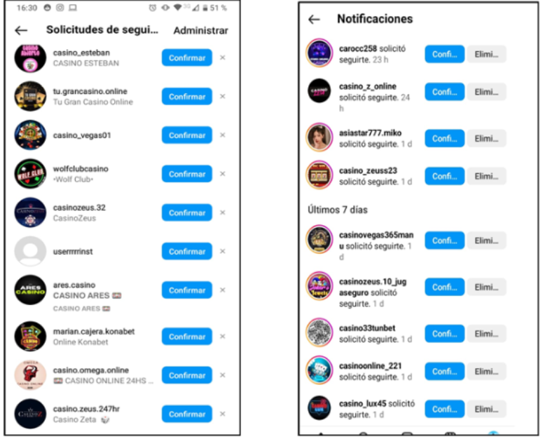 El trabajo de campo fue realizado entre julio y septiembre del 2023. En un primer momento, se implementó una observación no participante que constó del seguimiento de 6 cuentas de Instagram dedicadas exclusivamente a la promo- ción del juego online. La selección estuvo guiada por el cumplimiento de ciertos requisitos como, por ejemplo, que tuvieran más de 1.000 seguidores, que contarán con un perfil público -de acceso abierto- y que participaran activamente de la red social8. Una vez seleccionadas, se realizó un seguimiento alternado mediante un registro de campo, basado en capturas de pantallas con frecuencia semanal. En un segundo momento, se llevó a cabo una observación participante, para lo cual se estableció un contacto con dos cajeros (no entrevistados) con la finalidad de solicitar el ingreso a salas de juego. Durante dicha experiencia, se realizaron capturas de pantalla y notas de campo que permitieran registrar el procedimiento y las características de las plataformas.