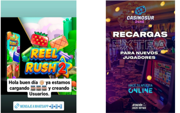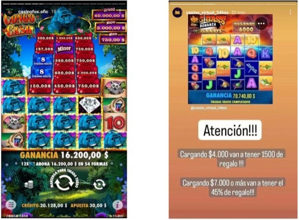 los bonos de bienvenidas y demás beneficios que se pueden obtener si se recurre a una determinada plataforma. A su vez, se pudo observar la publicación de cap- tura de pantallas vinculadas a las ganancias de otros usuarios, la confirmación de la transferencia de un determinado premio y reels ejecutados por influencers (celebridades) que recomiendan el uso de determinada plataforma. Este tipo de recursos busca aumentar el atractivo de la actividad y la credibilidad del público. Al igual que el estudio llevado a cabo por Morera Hernández (2020), no se observa una regulación o control de las publicidades que circulan en la red social, ni se hace mención del juego patológico y sus posibles consecuencias en la vida de una persona.
