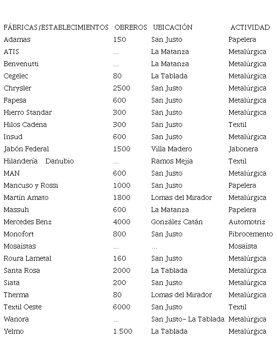 La solidaridad de los reclamos permitió englobar a dirigentes de diferentes sectores de la producción. La tabla 1 nos muestra los establecimientos productivos de la zona que llegaron a participar de las actividades desarrolladas por la CI de La Matanza.