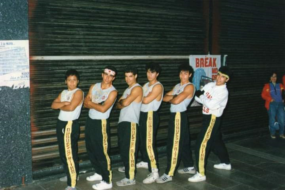 En ese contexto, un grupo de jóvenes que habitualmente bailaban música para discoteca comenzaron a practicar break dance, cambiando el espacio de la disco por el público. Si bien la práctica del break comenzó como una moda mediática, logró cohesionar a un grupo de jóvenes que no encajaban en otros gustos culturales. Entre los pioneros autodenominados vieja escuela podemos nombrar a José Justiniano El Abuelo (llamado así por ser uno de los mas adultos del grupo, que luego se dedicó a ser el Dj, hoy radicado en México), Hugo Liendro, David Justiniano, Fabio, El Indio, Electro Daniel, Ratón, las bgirls India, Caramelito y Estela, entre otros. Muchos de estos exponentes solo compartían el baile en el espacio público, sin embargo, algunos lograron organizarse para ensayar verdaderas coreografías y hasta compatibilizar vestuario común. A través de la afirmación de las identidades, grupos culturales se definen y se constituyen alrededor de todos los aspectos con los que se relacionan: sus necesidades, contestaciones, derechos, entre otros. Tal como lo explica Martins (2015) en el caso brasilero: “Se trata de la organización en torno de proyectos comunes, sobre todo culturales, donde los individuos comparten no solo el mismo territorio, sino también sus intereses, sus necesidades” (p. 21). Así surge la que está considerada la primera crew de Córdoba, Los duques del Ritmo (conformada por los bboy Hormiga, Martin Break, Claudio Electro, Gomina, Darío y Tomy Boy). De esa manera se comienzan a conformar agrupaciones las cuales se organizaban ensayando coreografías y hasta consiguiendo un vestuario uniforme. Los Duques del Ritmo es considerada la primera en dar ese paso (ver figura 1).