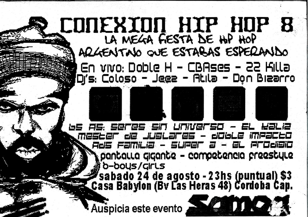 A fines de la década de 1990 se editan en Buenos Aires y con amplia distribución en disquerías, los compilados Nación Hip Hop (1997) y Nación Hip Hop 2 (1998), proyecto encabezado por Alejandro Almada con claras intenciones federales, pero lejos de incluir a Córdoba dentro de la selección (solo participaron exponentes de Buenos Aires, Mendoza y Rosario), por lo que los integrantes del grupo Doble H deciden organizar, en el año 2001 los eventos Conexión HH en Casa Babylon[10]. El primer año solo se realizaron dos encuentros, pero entre los años 2003 y 2004 llegaron a realizar un encuentro mensual, en los cuales participaron agrupaciones y solistas de todas las provincias. En el primer encuentro de Conexión HH se juntaron las distintas experiencias raperas de Córdoba (Nivel 7, Locotes, Doble H, 22 Killas, etc.), sumado a bboys y djs locales, lo que logra cohesionar a éstas en una sola escena local (ver figura 3), no solo de rap, sino de otros elementos del hip hop. En el año 2002 en Córdoba se realiza el primer campeonato de freestyle nacional en Casa Babylon en donde Mustafa Yoda obtiene el primer premio. Aparece en la radio La Roca el programa Rap Attack, comienzan a proliferar los talleres y se va conformando un público propio. En ese sentido, y tal como lo expresa Pedro et al (2018), encontramos en una primera instancia una estructura básica: músicos (y bailarines, djs y grafiteros), público y lugares de interacción musical, que en un primer momento fueron los espacios públicos o algunos clubes de barrio, que mantenían a los pequeños focos aislados. Gracias a la convocatoria de las fiestas Conexión HH, a esta estructura se le sumó inmediatamente una infraestructura: se multiplicó el público, aparecen programas especializados, discotecas y espacios abren sus puertas para espectáculos en vivo, etc. En ese sentido, las fiestas mencionadas sirvieron para cohesionar distintas movidas heterogéneas que se encontraban aisladas, y ayudó a tejer redes recíprocas que reforzaron una escena hip hop local.