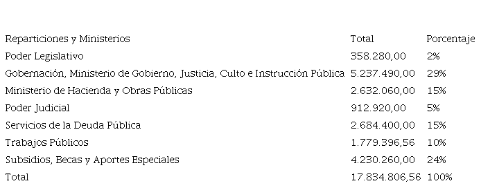 En la tabla 1 se puede observar la importancia presupuestaria del Ministerio de Gobierno en relación con las restantes reparticiones de la administración pública provincial. En el cálculo general de gastos, dicha cartera disponía aproximadamente del 30 % de los recursos, seguido por Subsidios, Becas y Aportes Especiales. Mientras, en torno al 15% se encontraba el Ministerio de Hacienda y Obra Pública junto con los Servicios de Deuda. Hacia dentro del Ministerio de Gobierno, Justicia, Culto e Instrucción Pública, las JPD contaban con presupuesto propio, solamente los sueldos y jornales insumían aproximadamente m$n 1.523.940 monto que representa poco más del 39% de lo presupuestado por la aquella cartera en dichos conceptos (tabla 2).