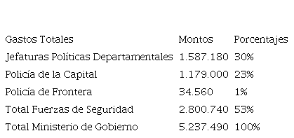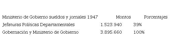 Mientras, los gastos en sueldos y jornales de las JPD, contabilizaban 1.523.940 cifra que representa un 39% de los gastos generales del Ministerio de Gobierno y aproximadamente un 9% del presupuesto provincial de 1947. Cabe aclarar que las fuerzas de seguridad o instituciones vinculadas directamente a dicha función, ya sea Policía de la Capital, Jefaturas Políticas Departamentales y Policías de Frontera representaban un 53% de los gastos de aquella cartera y un 15% de los gastos totales de la provincia (tabla 3). Por lo tanto, es necesario observar de cerca la relevancia de dichas instituciones al momento de los orígenes del peronismo santiagueño.