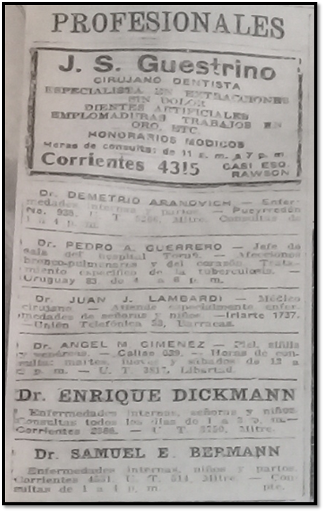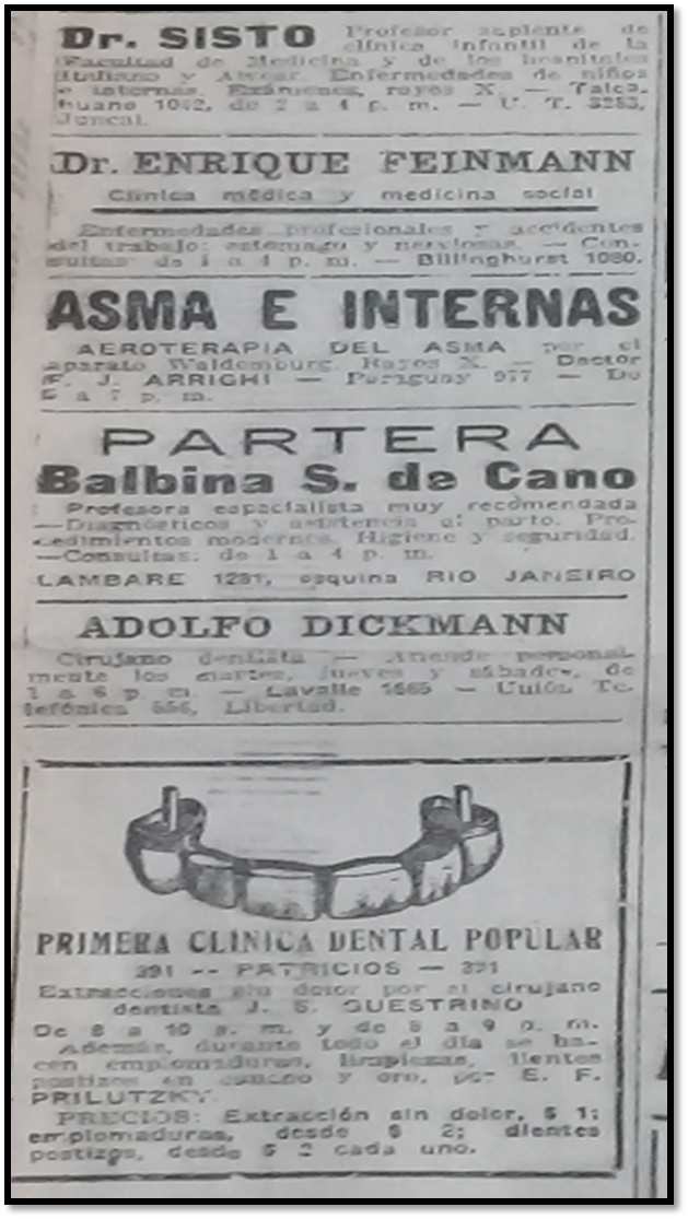 Los médicos eran percibidos socialmente como personas que podían reducir la miseria, educar al pueblo a través de un plan racional e higiénico, una vida más sana en lo físico y lo moral para los ciudadanos, figuras populares y respetadas en el entorno social en el que se movían. La existencia de profesionales de la medicina dentro del Partido Socialista, con Juan B. Justo[9] como figura más importante, fue un aspecto destacado dentro de la postura higienista del partido. Sería común ver a los líderes del PS ser presentados como modelos a seguir para la población y, más específicamente, para los ciudadanos socialistas, partícipes activos en la comunidad en cuanto a su contribución a la cultura, promocionando hábitos de lectura, buenas costumbres y respeto hacia la comunidad (Adelman, 2000). Era una práctica recurrente, por ejemplo, en las publicaciones del diario La Vanguardia del periodo, difundir publicidades de distintos médicos que pertenecían al partido con la posible idea de acercar la medicina a los lectores buscando instaurar hábitos más saludables (véase figura 1 y figura 2).