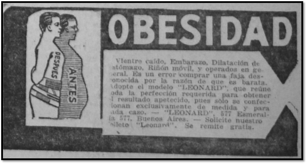 Por último, y como iniciativa significativa, una cuestión a resaltar con respecto a las secciones del diario La Vanguardia, es la importancia que se le da al deporte y al fomento de este para las masas populares, resaltando disciplinas como el fútbol, el atletismo y el ciclismo, entre otros. En esta sección puede destacarse la publicación del 1 de enero de 1921 un apartado con Algunos consejos para la conservación de la salud, en donde se plantean una serie de principios para seguir hábitos en la vida, y en el tiempo libre, que generen mayor salud, fuerza y vitalidad. De esta manera cuestiones como ejercicios de respiración, ventilar bien los ambientes, incluso en invierno proponen dormir con las ventanas abiertas, beber abundante agua y alimentarse con cereales y frutas, cuidar la dentadura, consejos en cuanto al baño diario referidos a la duración y temperatura del agua; el descanso y la realización de ejercicios diarios; son recomendaciones que se enmarcan en el cuidado físico que a partir de las tendencias higienistas se volvieron significativas para un mejor estilo de vida de las personas, pero, también, como una manera de mejorar la estética de los sujetos de lo que, para el periodo, era considerado adecuado. A modo de ejemplo, puede destacarse una publicidad referida a la cuestión del sobrepeso (figura 4).